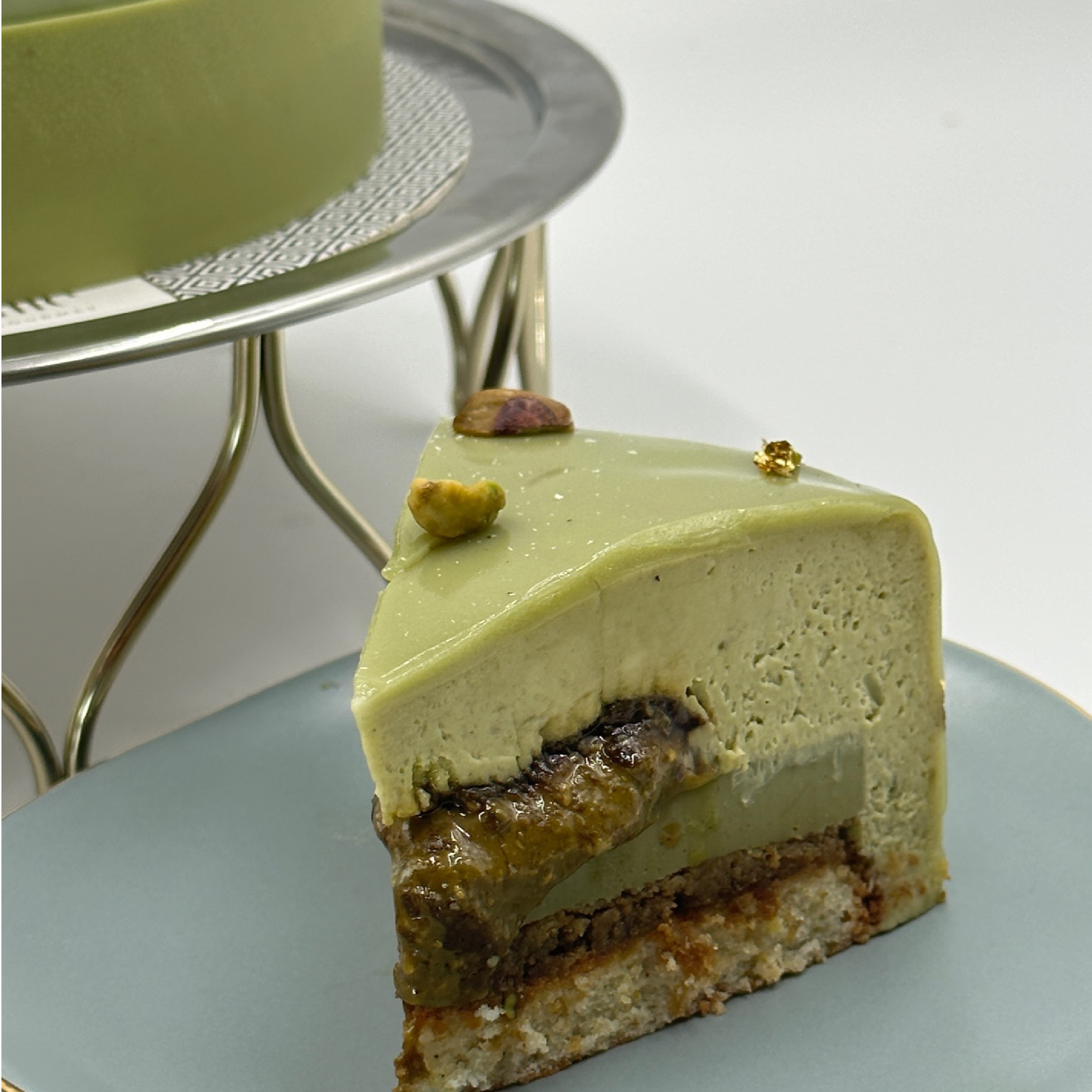 La Sicilienne est un entremets raffiné pour 8 à 10 personnes, entièrement dédié à la pistache, avec des couches de textures et de saveurs subtiles. Ce dessert est composé d'une dacquoise pistache moelleuse, d'un crémeux pistache onctueux, d'un croustillant pistache délicatement croquant, et d'un praliné pistache intense. Le tout est sublimé par une ganache montée à la pistache légère et aérienne, et enveloppé dans un glaçage pistache lisse et brillant.